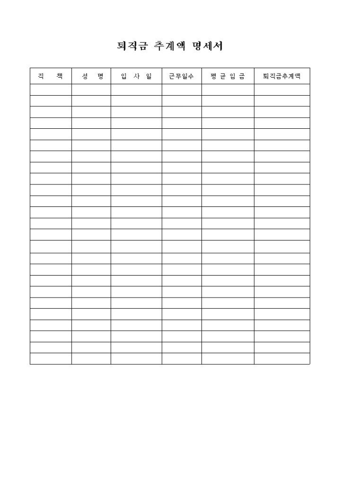 9,000원/월직책,성명,입사일,근무일수,평균임금,퇴직금추계액으로 구성된 퇴직금 추계액 명세서입니다.