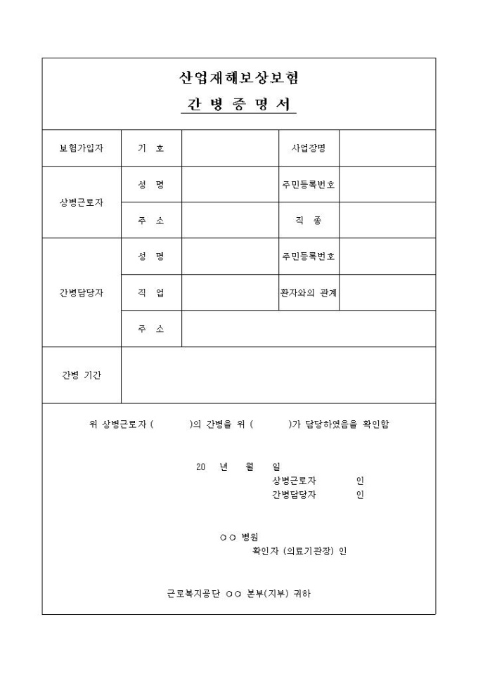 9,000원/월산업재해보상보험용 간병증명서입니다. 상병근로자의 간병을 담당하였음을 확인하는 양식으로서 보험가입자, 상병근로자, 간병담당자, 간병기간의 항목으로 구성되어 있습니다.