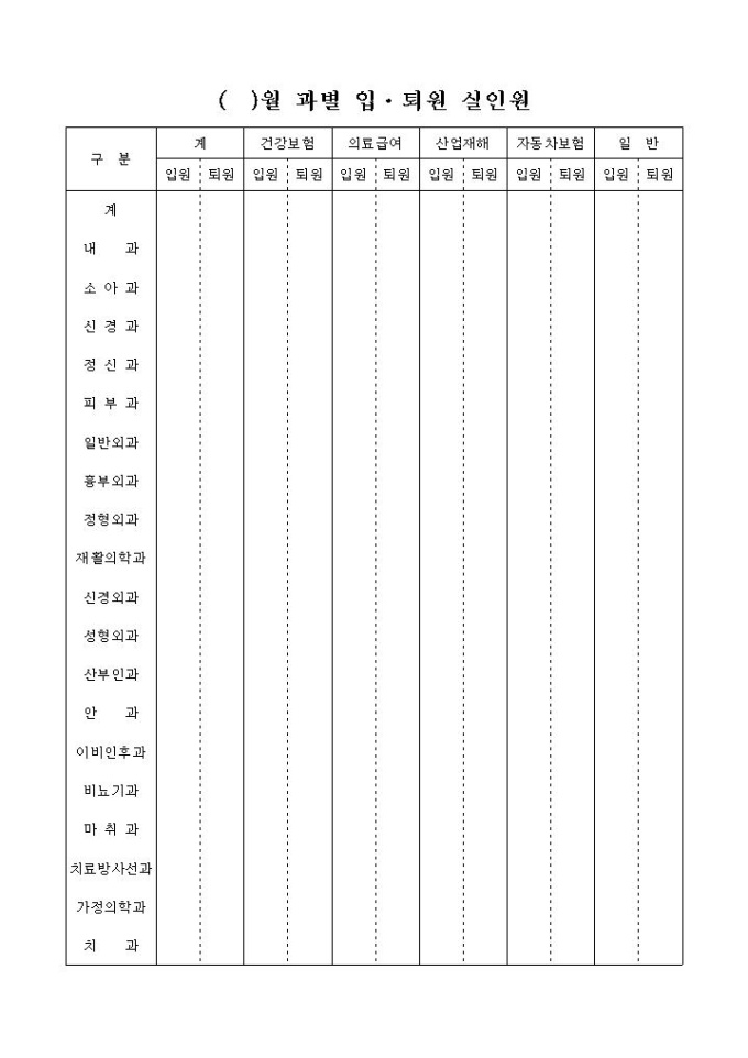 9,000원/월각과별로 건강보험, 의료급여, 산업재해, 자동차보험, 일반의 유형으로 입·퇴원 실인원의 통계를 나타낼 수 있는 양식입니다.