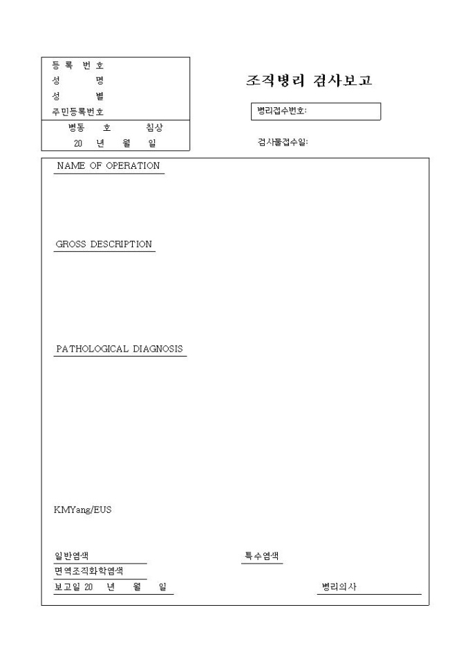 9,000원/월조직병리 검사보고서 양식입니다. 검사자의 신상내역과 NAME OF OPERATION, GROSS DESCRIPTION, PATHOLOGICAL DIAGNOSIS, KMYang/EUS 항목으로 구성되어 있습니다.
