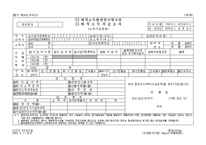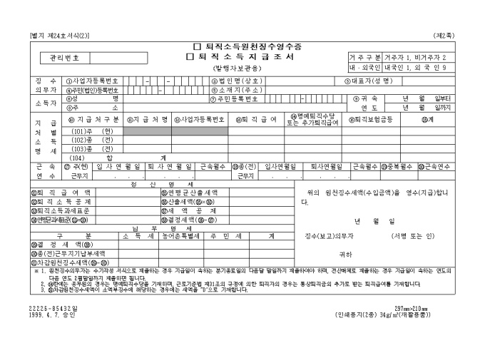 9,000원/월퇴직소득원천징수영수증 양식입니다. 원천징수세액(수입금액)을 영수(지급)하실때 사용하는 양식입니다.