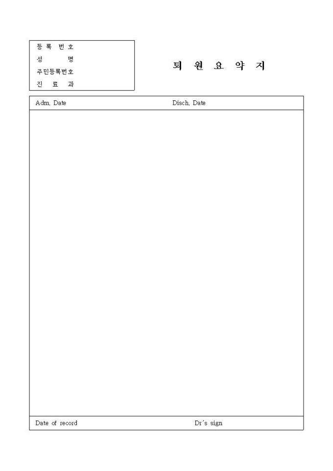 9,000원/월환자가 병원 퇴원 시 그 관련내용을 기록하는 퇴원요약지입니다.