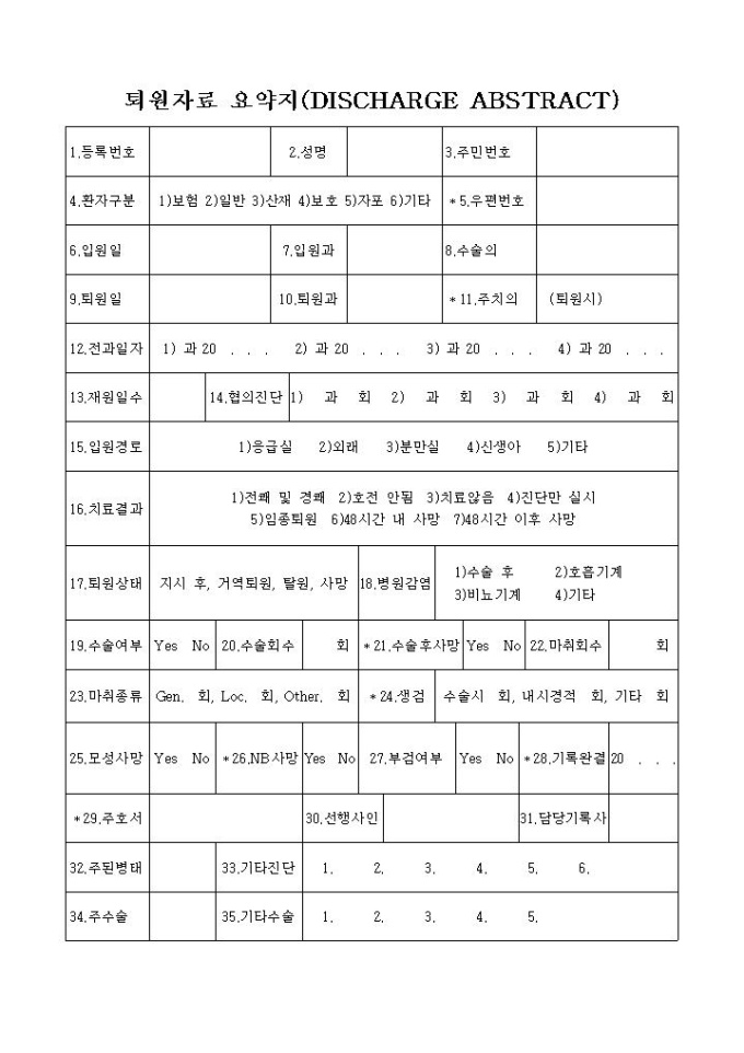 9,000원/월환자가 병원에서 퇴원 시 진료내용에 대한 기록을 남기는 양식으로 총 34개의 문항으로 구성되어 있습니다.