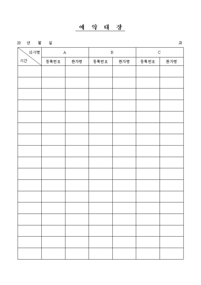 9,000원/월환자 진료 시 예약 환자에 대한 관리를 할 수 있는 양식입니다. 시간대별로 예약 환자의 현황을 기록할 수 있습니다.