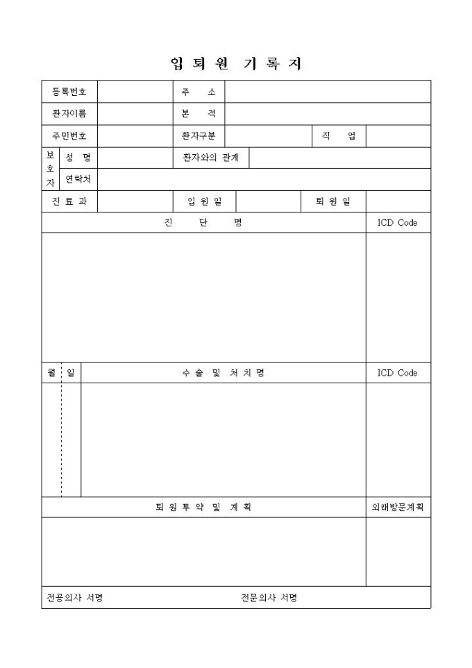 9,000원/월환자의 입원, 퇴원에 관련된 사항을 기록하고 관리하는 양식입니다. 환자의 인적사항과 입원시 이루어진 수술 및 처치에 관한 사항, 퇴원투약 및 계획에 관한 기록을 할 수 있습니다.