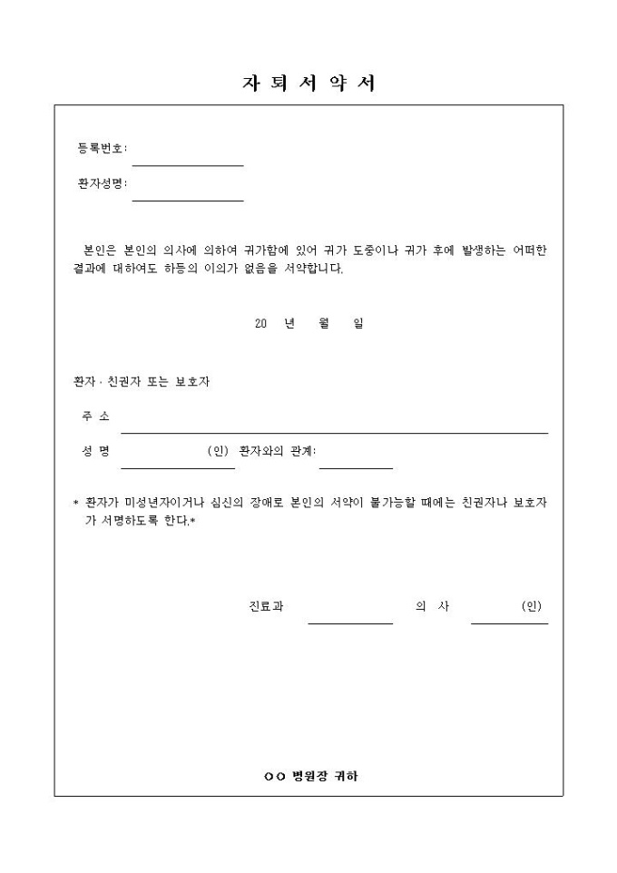 9,000원/월환자가 본인의 의사에 따라 귀가함에 있어 발생하는 어떠한 결과에 대해서도 책임을 지겠다는 서약서 양식입니다.
