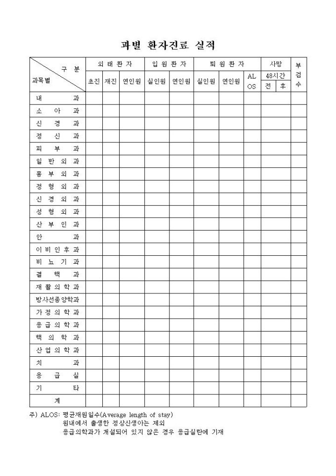 9,000원/월병원 각과별로 환자에 대한 진료 실적을 기록할 때 사용하는 양식입니다. 환자는 외래환자, 퇴원환자, 입원환자, 사망으로 구분되어 있습니다.