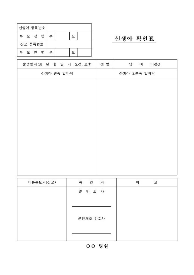 9,000원/월신생아 확인기록지는 신생아의 출생일시, 성별, 오른쪽/왼쪽 발바닥 모양의 기록으로 신생아를 관리하는 양식입니다.