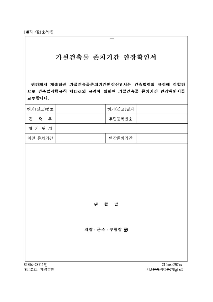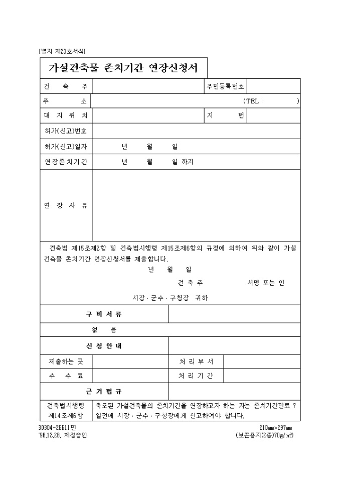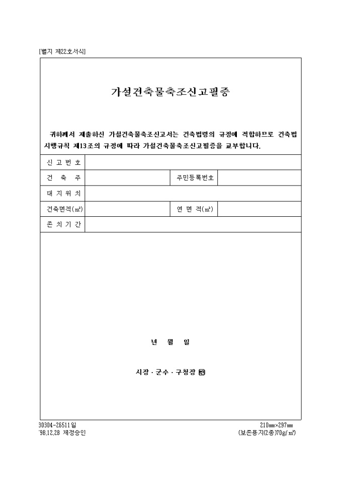 [별지 제21호서식] 가설건축물축조신고서 입니다. 건축법 제15조제2항 및 건축법시행규칙 제13조의 규정에 따라 위와 같이 가설건축물축조신고서를 제출하실때 사용하는 양식입니다.