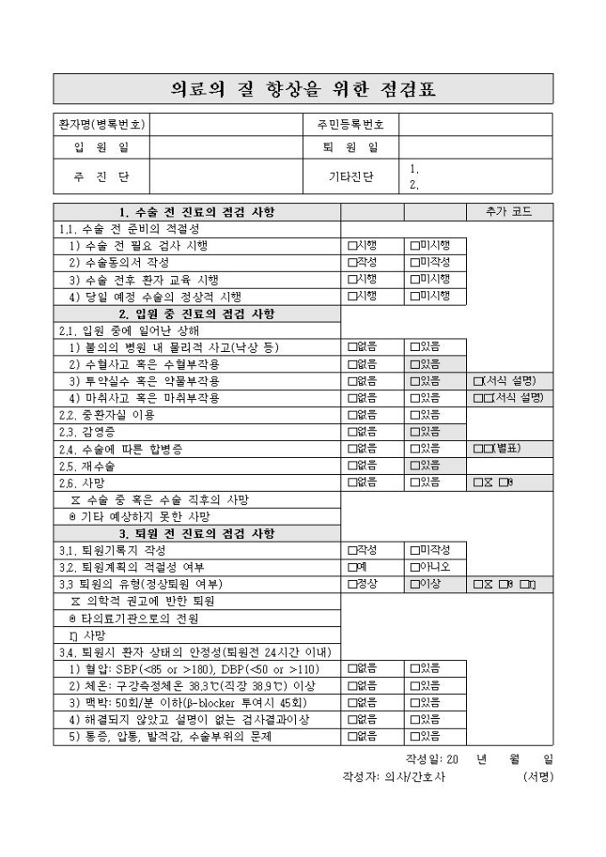 9,000원/월의료 질 향상을 위해 진료시 이루어져야 할 부분에 대해 점검을 할 때 사용하는 양식입니다. 수술 전 진료의 점검사항, 입원 중 진료의 점검사항, 퇴원 전 진료의 점검사항의 구분하여 기록할 수 있습니다.