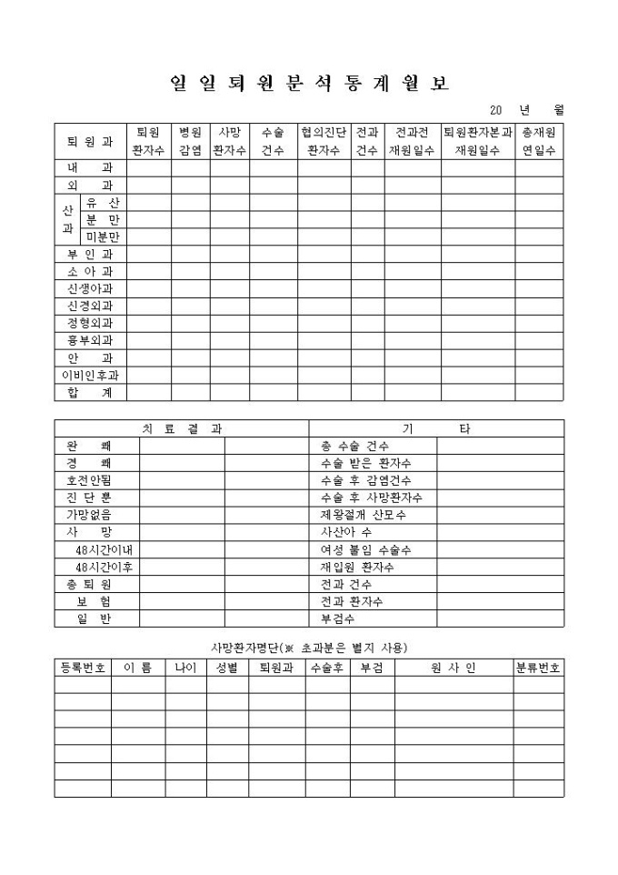 9,000원/월각과별로 기록하였던 일일퇴원분석자료의 월 통계치를 기록, 관리하는 양식입니다.