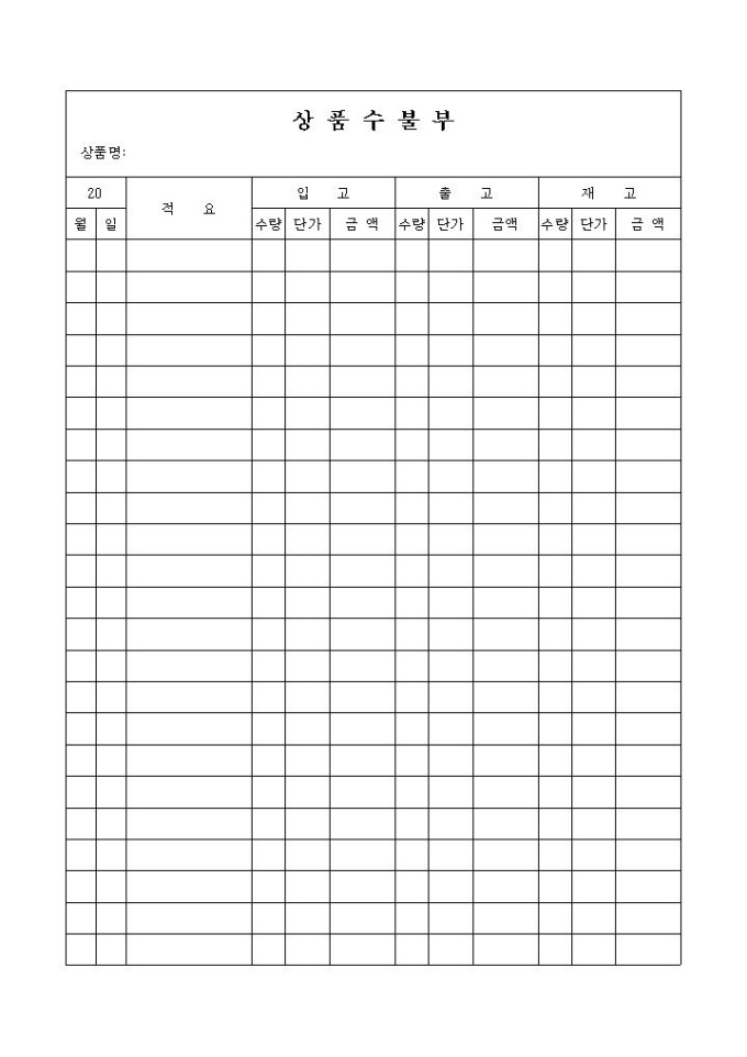 9,000원/월상품의 입고, 재고, 출고에 관한 사항을 기록/ 관리할 때 사용하는 양식입니다. 날짜, 적요, 입고, 출고, 재고의 항목으로 구성되어 있습니다.