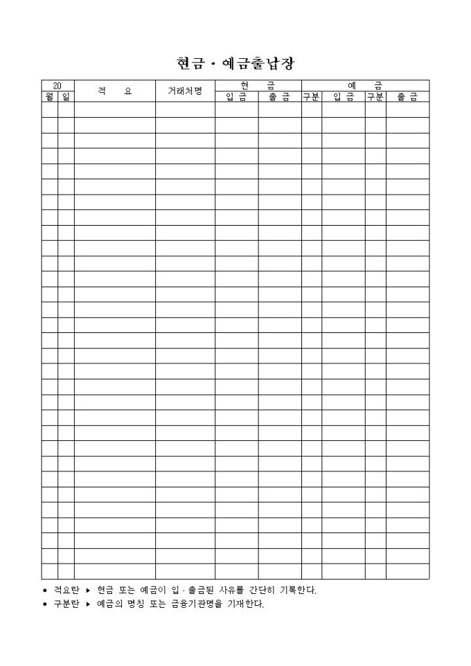 9,000원/월세로 용지에 작성한 현금·예금출납장 양식입니다. 날짜, 적요, 거래처명, 현금, 예금의 항목으로 구성되어 있습니다.