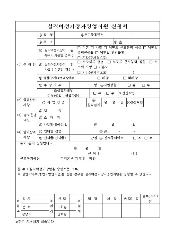 9,000원/월실직여성가장 자영업 지원 신청서는 신청인의 인적사항, 실업관련사항, 점포운영 개요, 임대관계 사항 등의 항목으로 구성되어 있습니다.