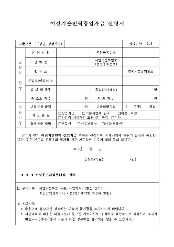 9,000원/월여성 기술 인력 창업자금 신청서는 신청인 현황, 지원신청 등의 항목으로 구성되어 있습니다.