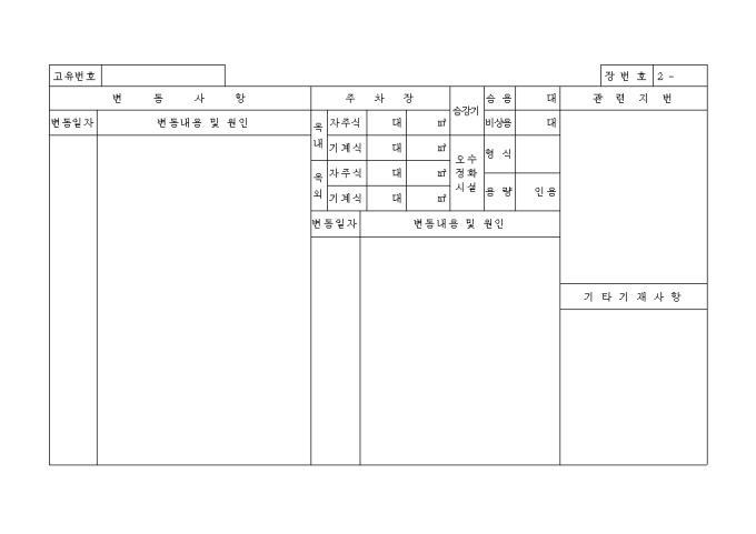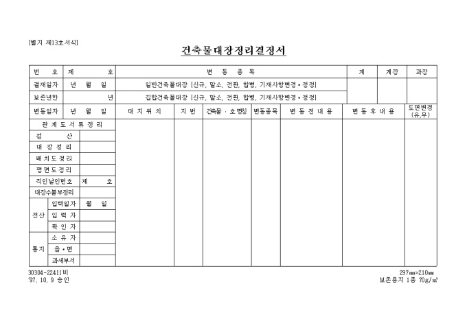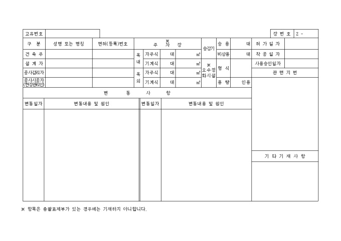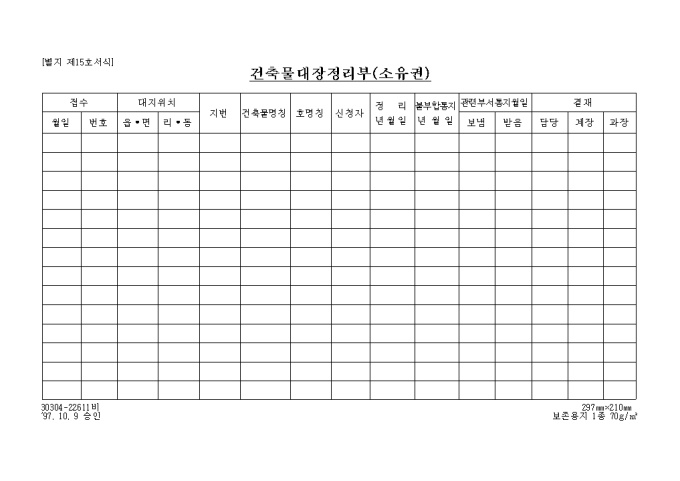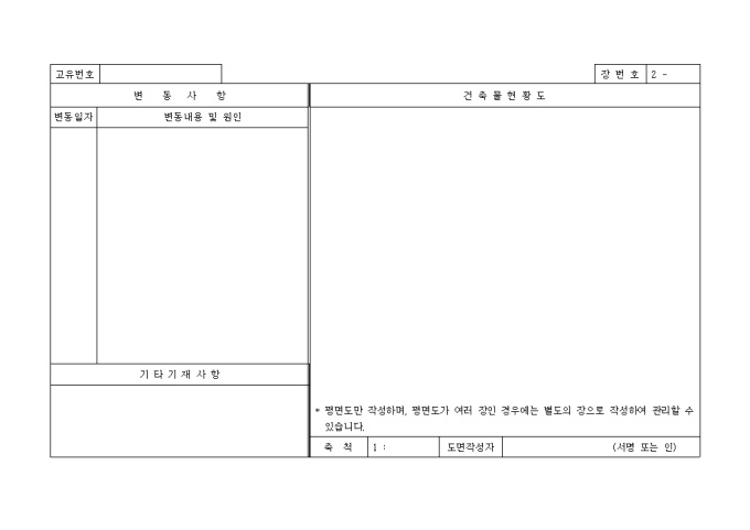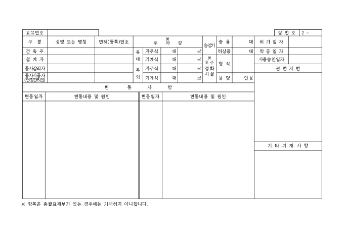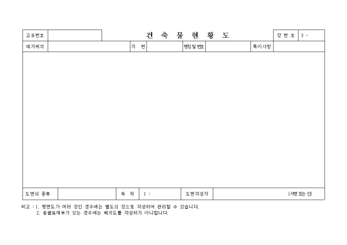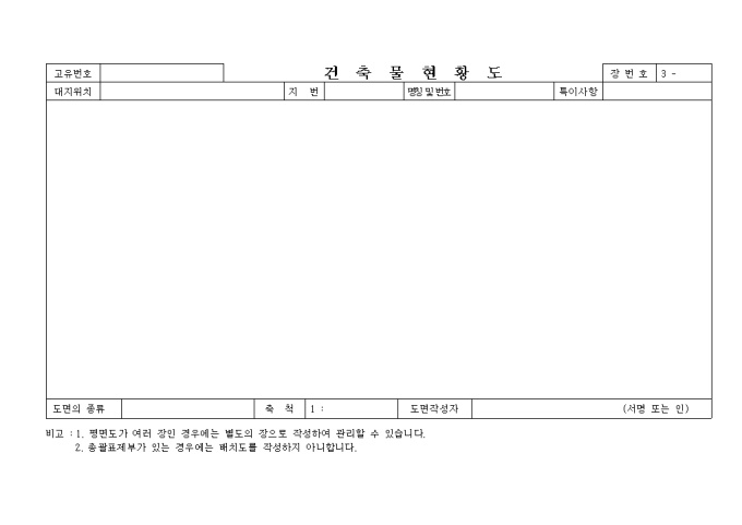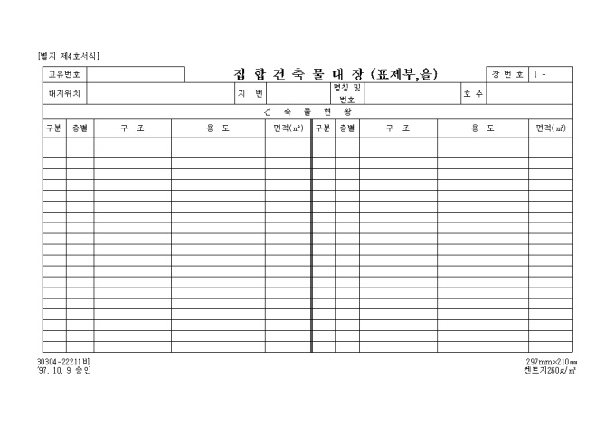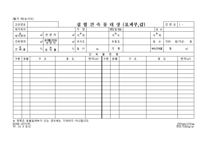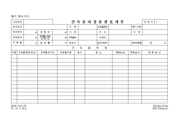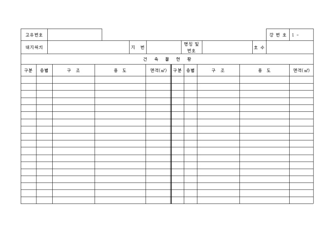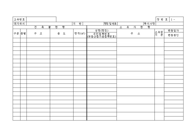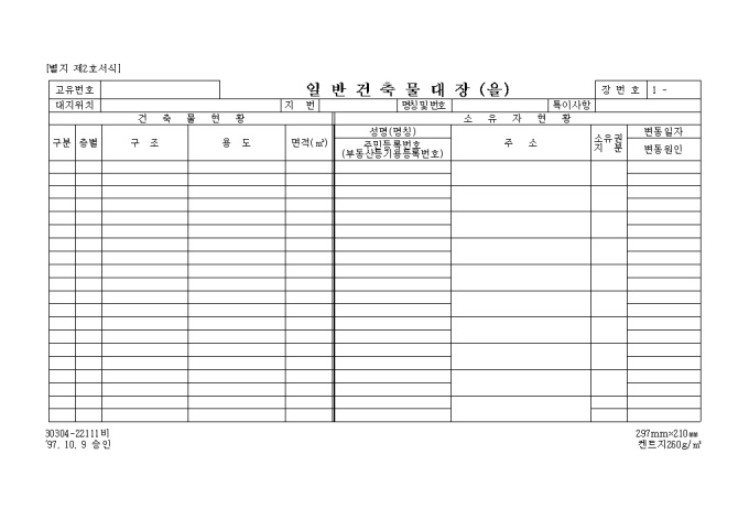 9,000원/월[별지 제1호서식] 일반건축물대장 입니다. 대지위치, 지번, 명칭 및 번호, 특이사항과 건축물현황, 소유자현황등의 세부 항목으로 구성된 양식입니다.