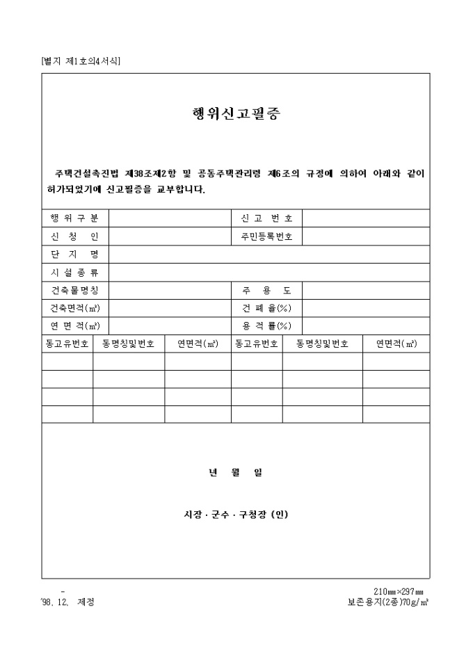 9,000원/월[별지 제1호의2서식] 행위신고신청서 입니다. 주택건설촉진법 제38조제2항 및 공동주택관리령 제6조의 규정에 의하여 위와 같이 신고하실때 사용하는 양식입니다.