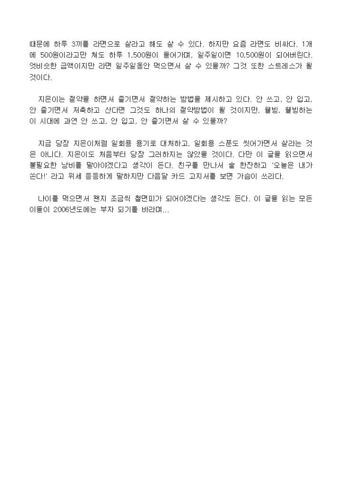 9,000원/월[본문 미리보기] 이 글의 지은이는 33살(2006년도는 34살)의 평범한 전업주부이다. 다음 ´카페에 한 달 생활비 10만 원 아줌마의 잡다한 절약이야기´ 연재하여 그 노하우를 책으로 펼쳐진 것이다.