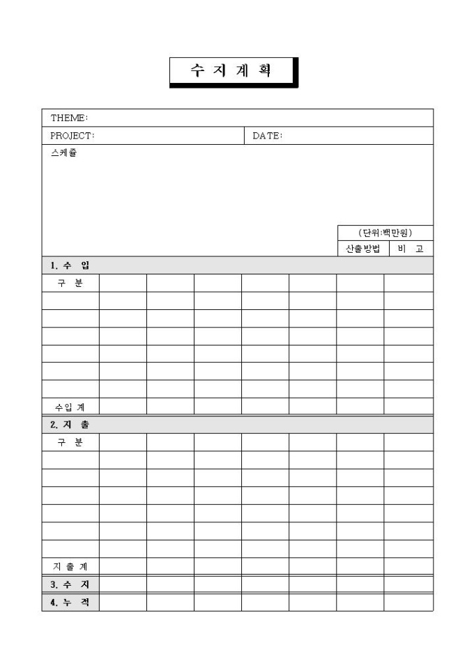 9,000원/월THEME, PROJECT, DATE, 스케쥴, 수입, 지출, 수지, 누적 등의 항목으로 구성된 수지계획표 양식입니다.