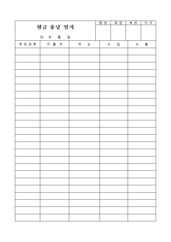 9,000원/월현금의 일일 출납 사항을 기록할 수 있도록 구성된 현금 출납 일지 양식입니다. 계정과목, 지불처, 적요, 수입, 수출 등의 항목으로 구성되어 있습니다.