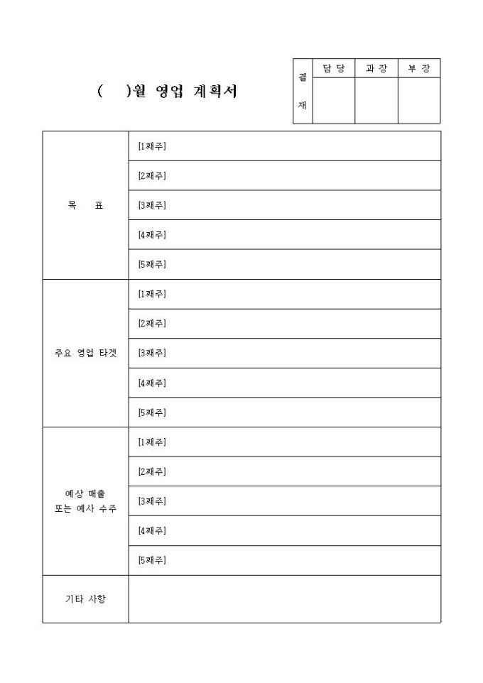 9,000원/월월간 영업에 대한 목표, 주요영업타겟, 예상 매출 또는 예사 수주, 기타의 항목에 대한 내용을 계획/관리 할 때 사용하는 월간 영업 계획서 양식입니다.