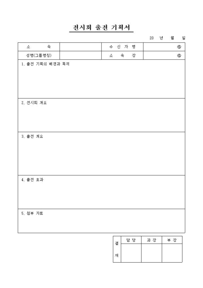 9,000원/월출전 기획의 배경과 목적, 전시회 개요, 출전 개요, 출전 효과, 첨부 자료 등의 항목으로 구성된 전시회 출전 기획서 양식입니다.