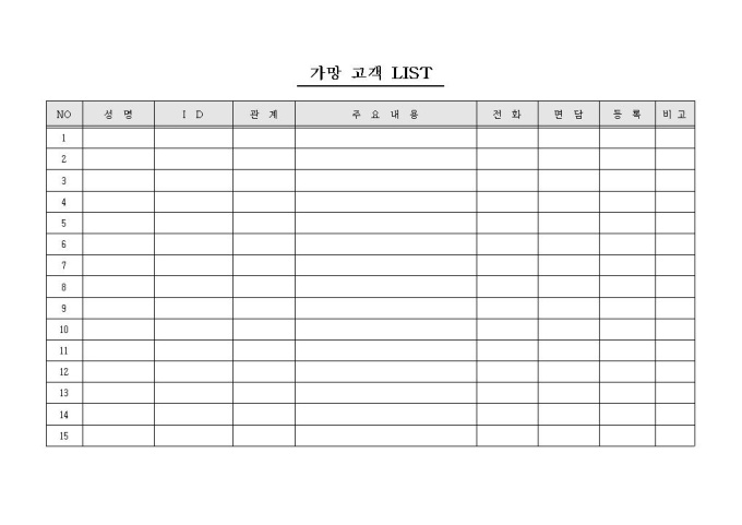 9,000원/월번호, 성명, ID, 관계, 주요내용, 전화, 면담, 등록, 비고의 항목으로 구성된 가망 고객 LIST 양식입니다.