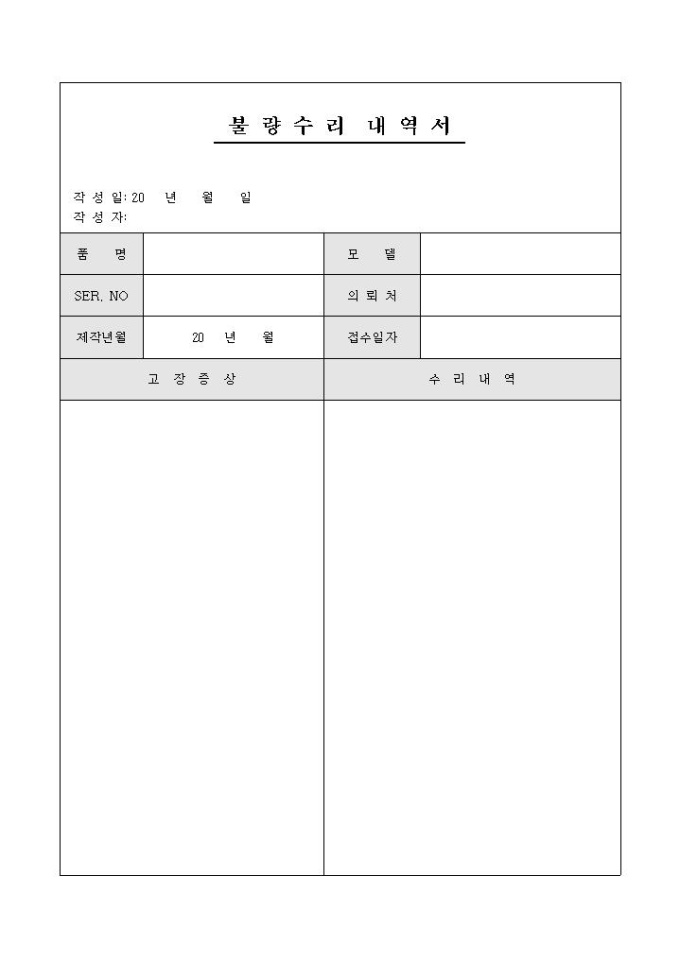 9,000원/월불량에 대한 수리내역을 기록/ 관리할 때 사용하는 불량수리 내역서 양식입니다. 품명, 모델, 의뢰처, 제작년월, 접수일자, 고장증상, 수리내역 등의 항목으로 구성되어있습니다.