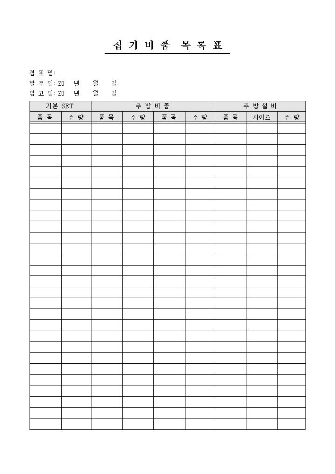 9,000원/월집기비품을 기록/ 관리할 때 사용하는 집기비품 목록표 양식입니다. 기본 SET, 주방비품, 주방설비의 항목으로 구성되어있습니다.