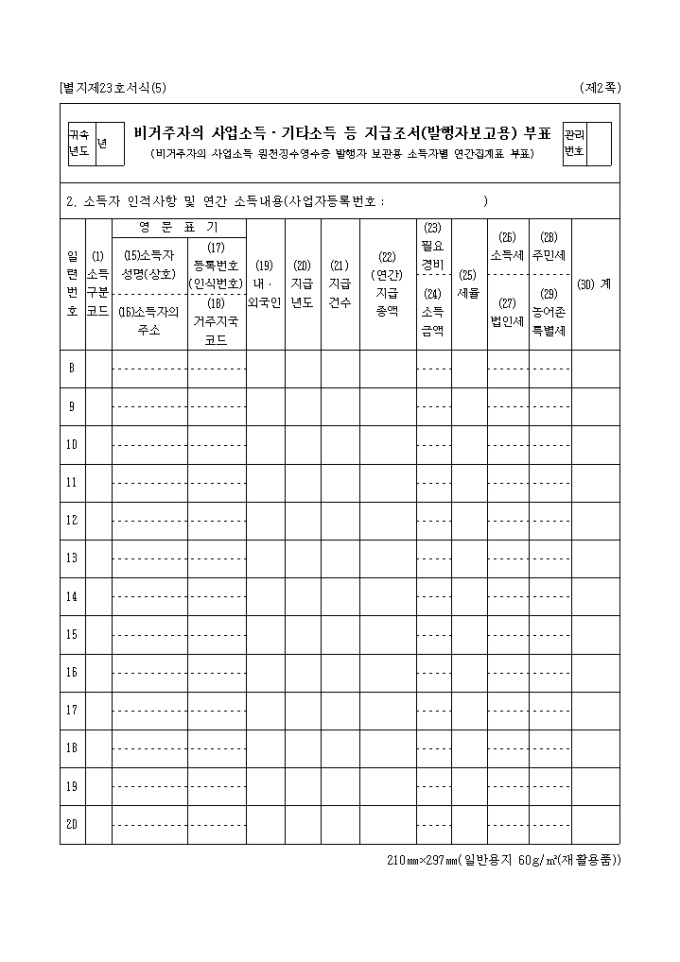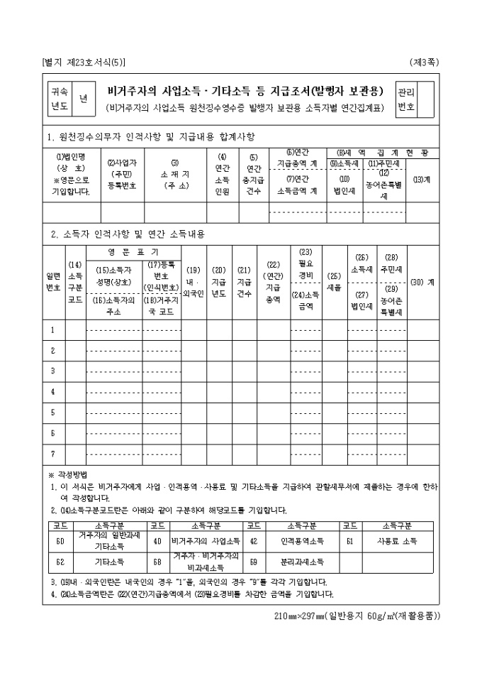 9,000원/월[2006년연말정산]비거주자의사업소득,기타소득등원천징수영수증(지급조서) 양식입니다. 2006년 연말정산에 대한 비거주자의 사업 소득,기타 소득등 원천징수 영수증(지급조서) 양식입니다.