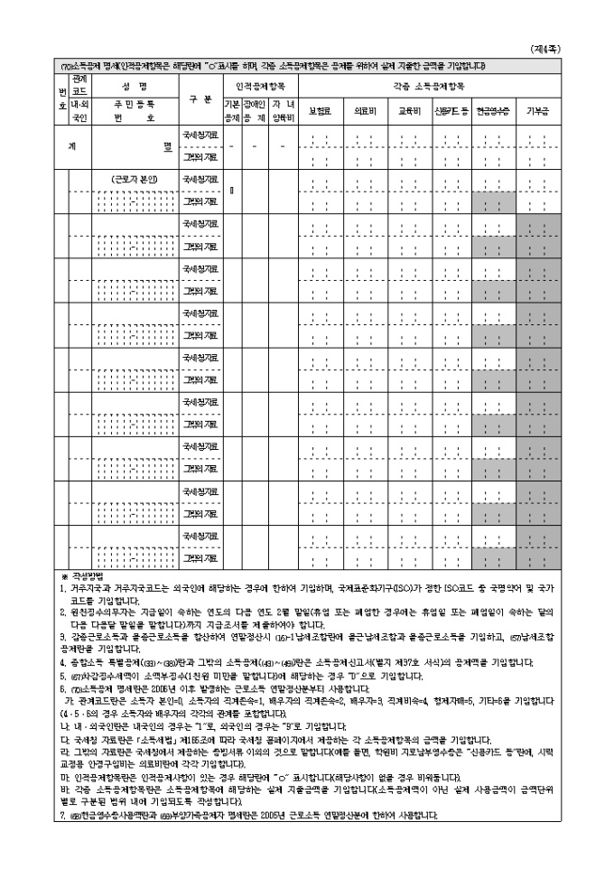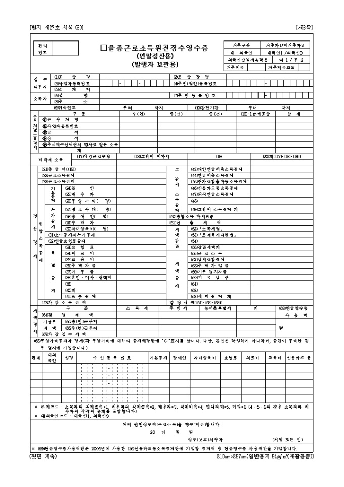 9,000원/월[2006년연말정산]을종근로소득원천징수영수증(지급조서) 양식입니다. 2006년 연말정산 시 필요한 서식으로 2006년 4월 10일 개정되었습니다.