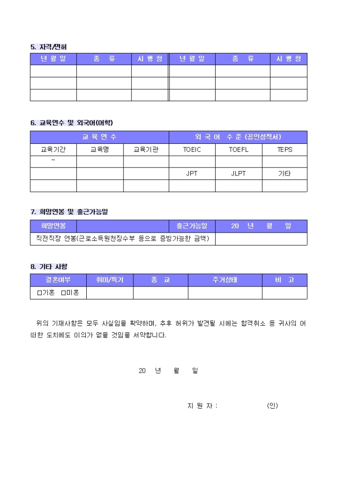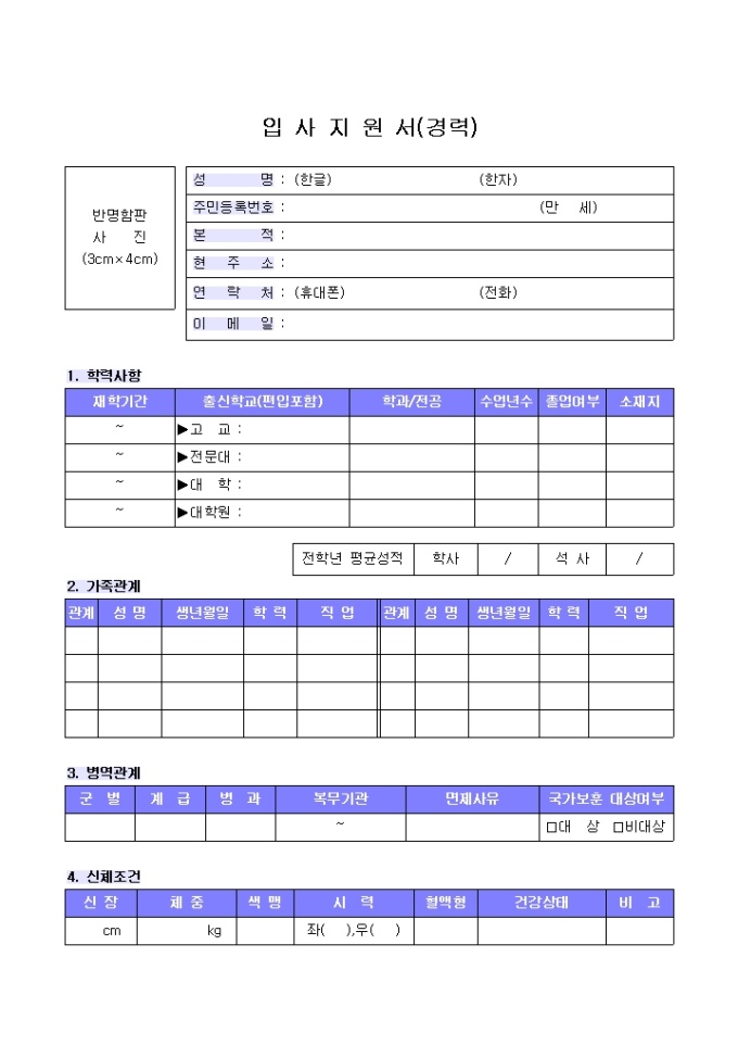 9,000원/월인적사항, 학력사항, 가족관계, 병역관계, 신체조건, 자격/면허, 교육기간및외국어, 희망연봉, 기타사항의 항목으로 구성되어있는 경력자용 컬러 이력서 양식입니다.