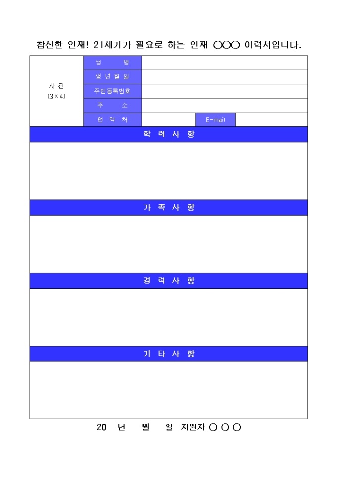 9,000원/월학력사항, 가족사항, 경력사항, 기타사항을 작성할 수 있도록 간단한 표로 구성되어 있는 이력서 양식입니다.