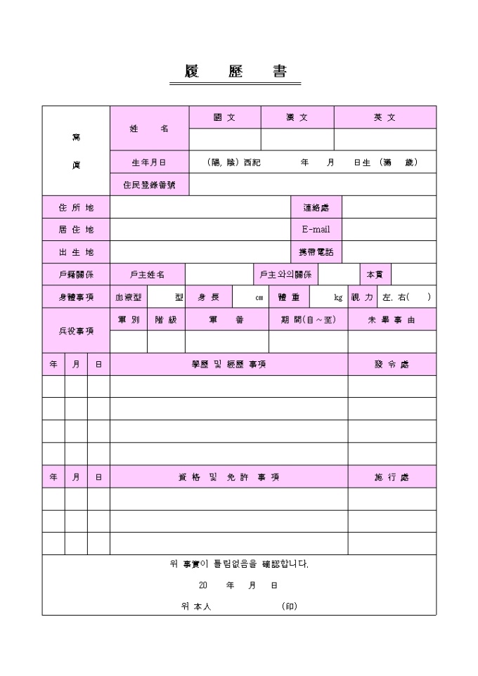 9,000원/월한문으로 작성된 기본형식의 칼라로 된 이력서 양식입니다.