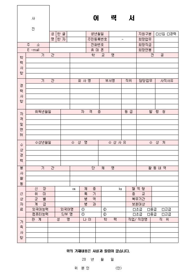 9,000원/월인적사항, 학력사항, 경력사항, 자격및면허, 수상경력, 봉사활동, 신상자료, 가족사항의 항목으로 구성되어있는 신입,경력 겸용 칼라 이력서 양식입니다.