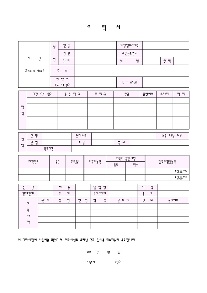 9,000원/월일반적인 항목으로 구성되어 있는 칼라 이력서 양식입니다.