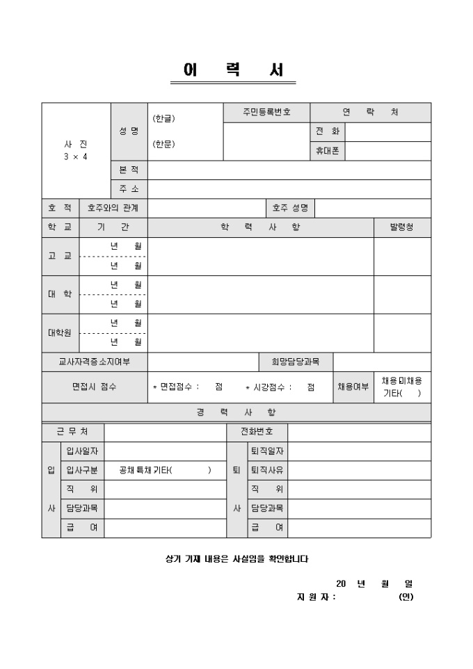 9,000원/월인적사항과 학력사항, 경력사항으로 구성된 학원교직원용 칼라이력서 양식입니다.
