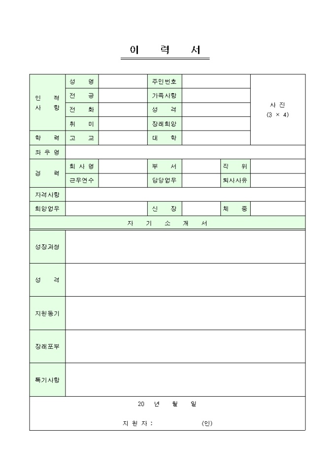 9,000원/월한장으로 자신의 이력과 자기소개를 할 수 있는 이력서 양식입니다.