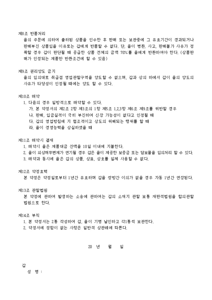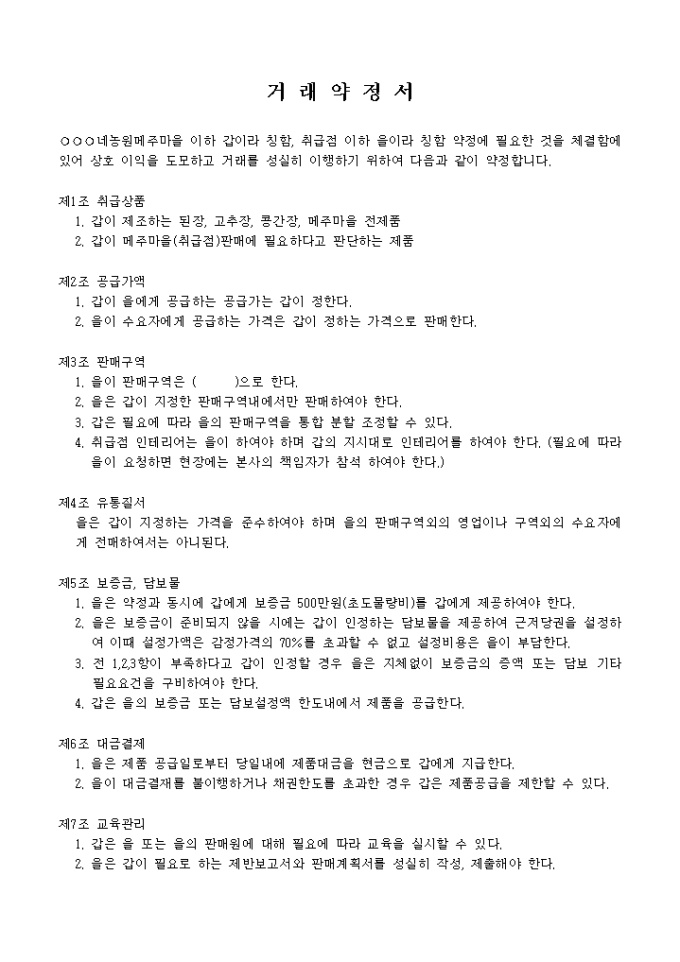 9,000원/월특정회사가 제품 취급점과의 약정에 필요한 것을 체결함에 있어 상호 이익을 도모하고 거래를 성실히 이행함을 명시하는 약정서 양식입니다.모두 14개의 조항으로 되어 있습니다.