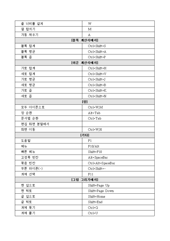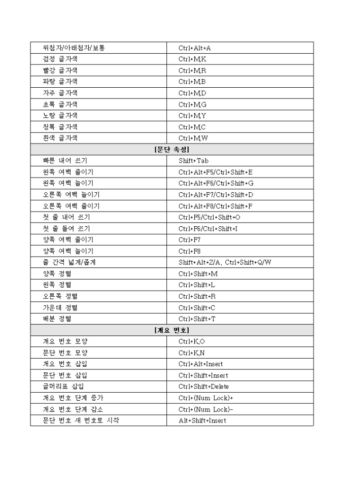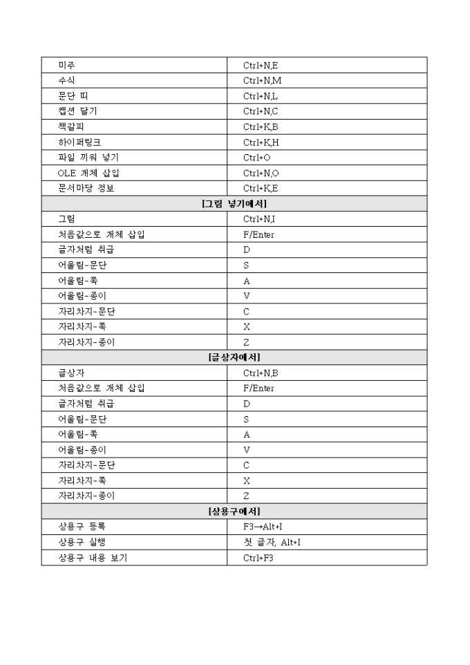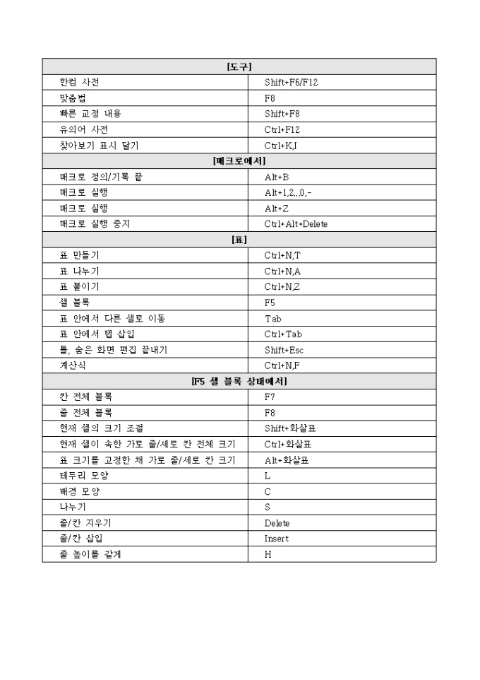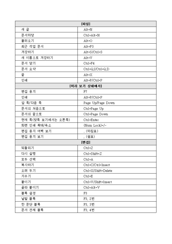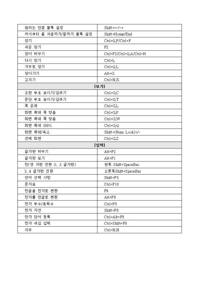 한글 2002에서 사용할 수 있는 단축키를 정리해 놓은 양식입니다.