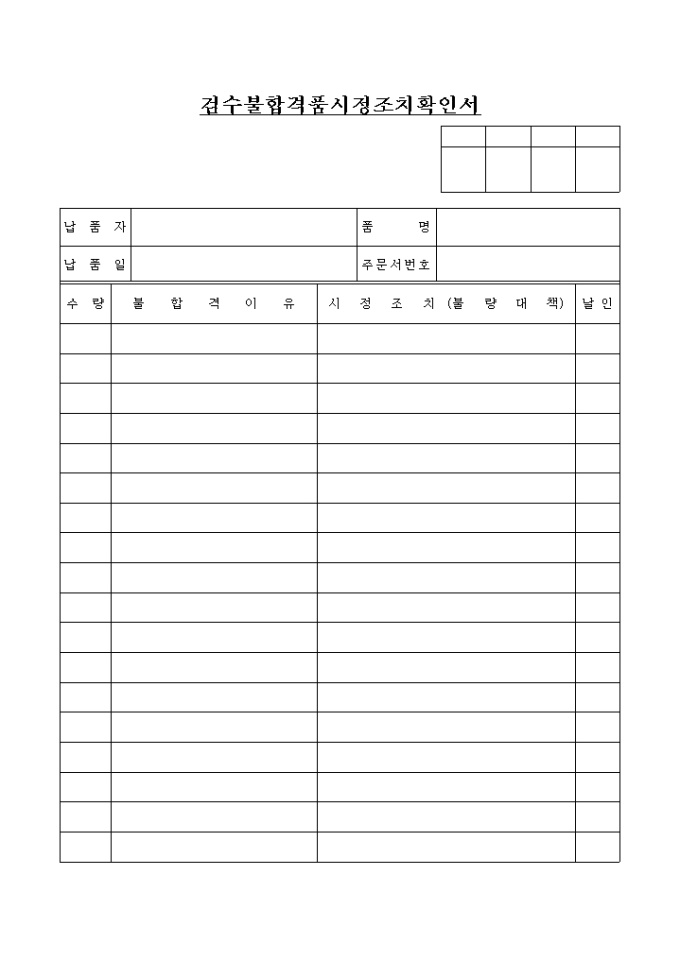 9,000원/월검수불합격품시정조치확인서 양식입니다. 검수결과 불합격품에 대한 불합격이유, 시정조치등을 기록 확인하실수 있는 양식입니다.