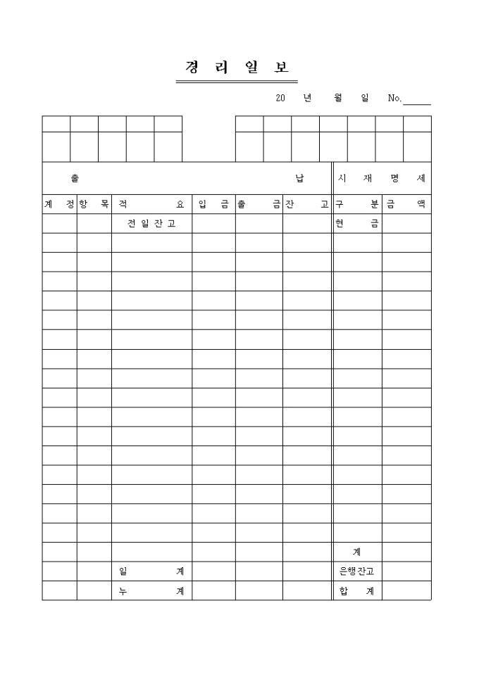 9,000원/월현금 출납사항을 기록할 수 있도록 구성된 경리일보 양식입니다. 출납에 대한 계정, 항목, 적요, 입금, 출금, 잔고 및 시재명세 등의 내용을 기재할 수 있습니다.