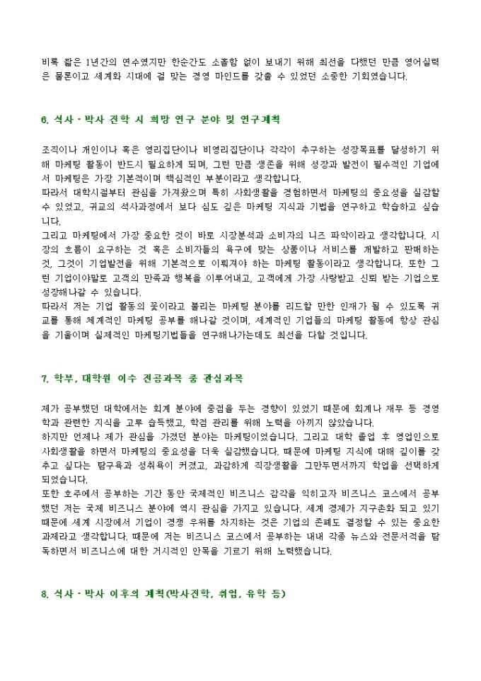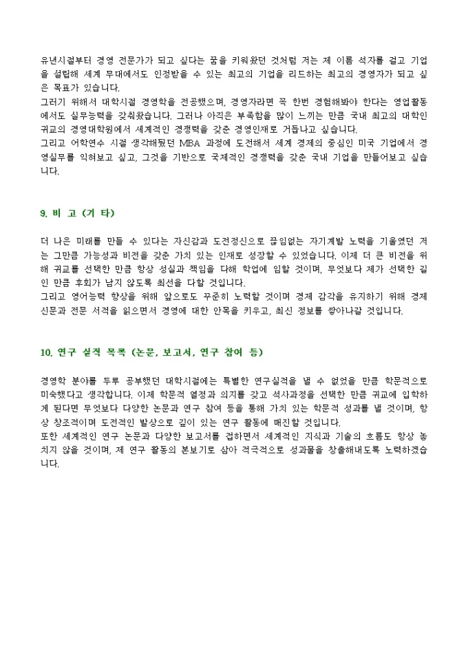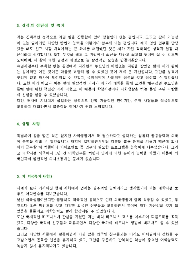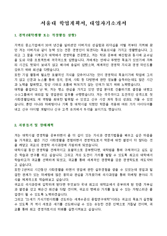 9,000원/월지역의 중소기업에서 30여 년간을 일하셨던 아버지의 성실함과 리더십을 어릴 적부터 지켜봐 왔던 저는 아버지와 같이 능력 있는 전문 경영인이 되겠다는 목표의식을 가지고 생활했습니다. 그리고 그 꿈을 이루고자 대학에서 경영학을 전공했고, 저는 학과 공부에 매진함과 동시에 교수님을 도와 각종 프로젝트에 적극적으로 임했습니다.