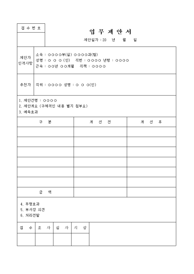 9,000원/월제안자 인적사항, 추천자, 구분, 개선전 등의 항목으로 구성되어있는 일반 업무제안서 양식입니다.