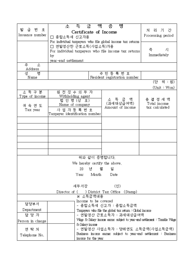 9,000원/월발급번호, 주소, 성명, 주민등록번호 등의 항목으로 구성되어있는 영문소득금액증명원 양식입니다.