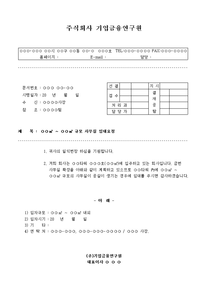9,000원/월사무실 임대 요청에 관한 내용이 있는 요청공문입니다.
