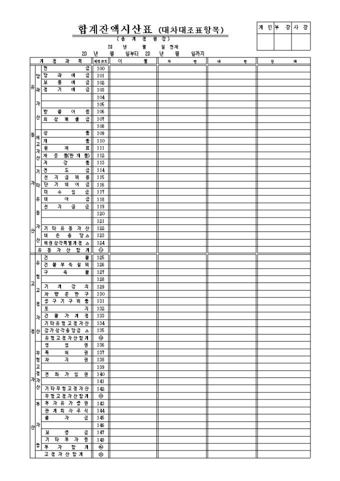 일정기간동안 발생한 모든 계정과목들의 합계를 차대로 구분해서 적어놓은 양식입니다.