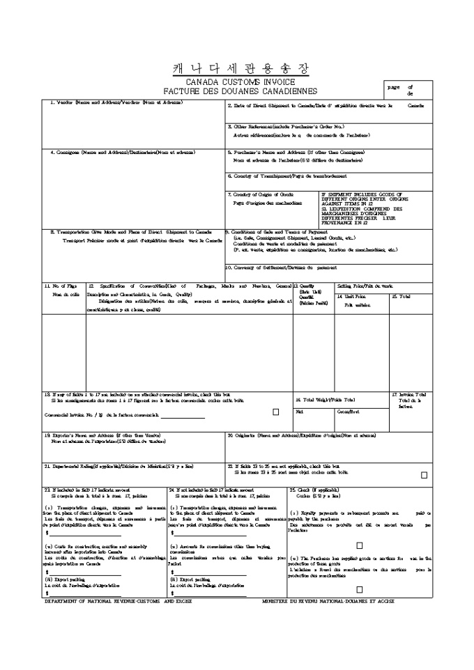 캐나다세관용송장(CANADA CUSTOMS INVOICE FACTURE DES DOUANES CANADIENNES)