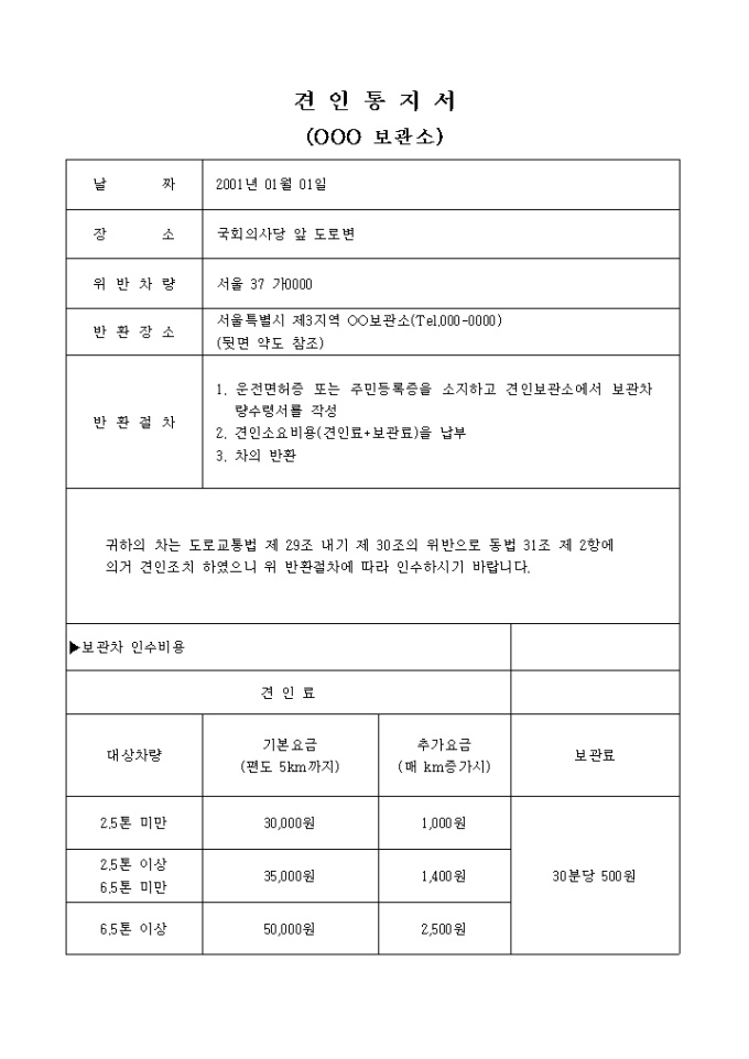 9,000원/월도로교통법 제 29조 내기 제 30조의 위반으로 동법 31조 제 2항에 의거 견인조치 하였으니 위 반환절차에 따라 인수에 촉구하는 견인 통지서 양식입니다.