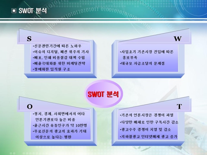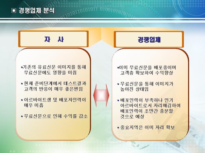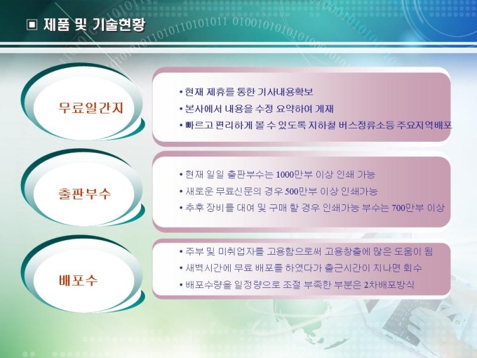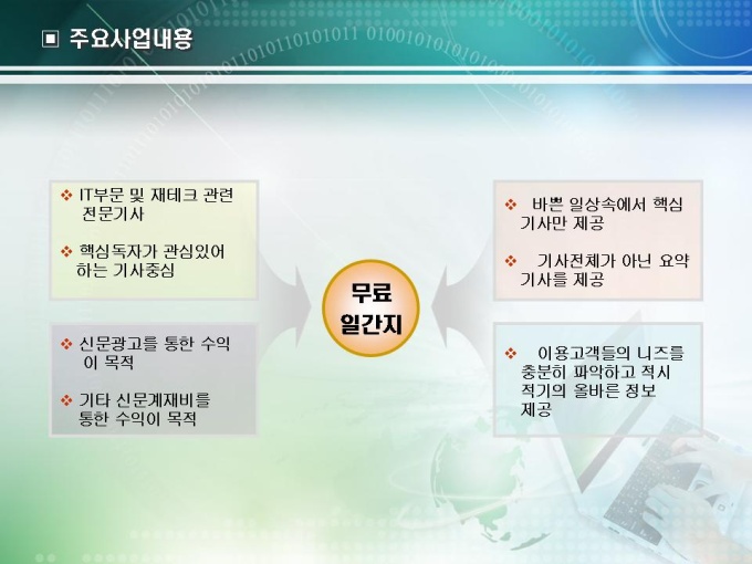 사업계획서 작성 예제입니다. 무료일간지의 사업계획서로 목차는 1.회사현황 2.사업현황 3.시장분석 4.사업추진전략으로 구성되어있습니다.